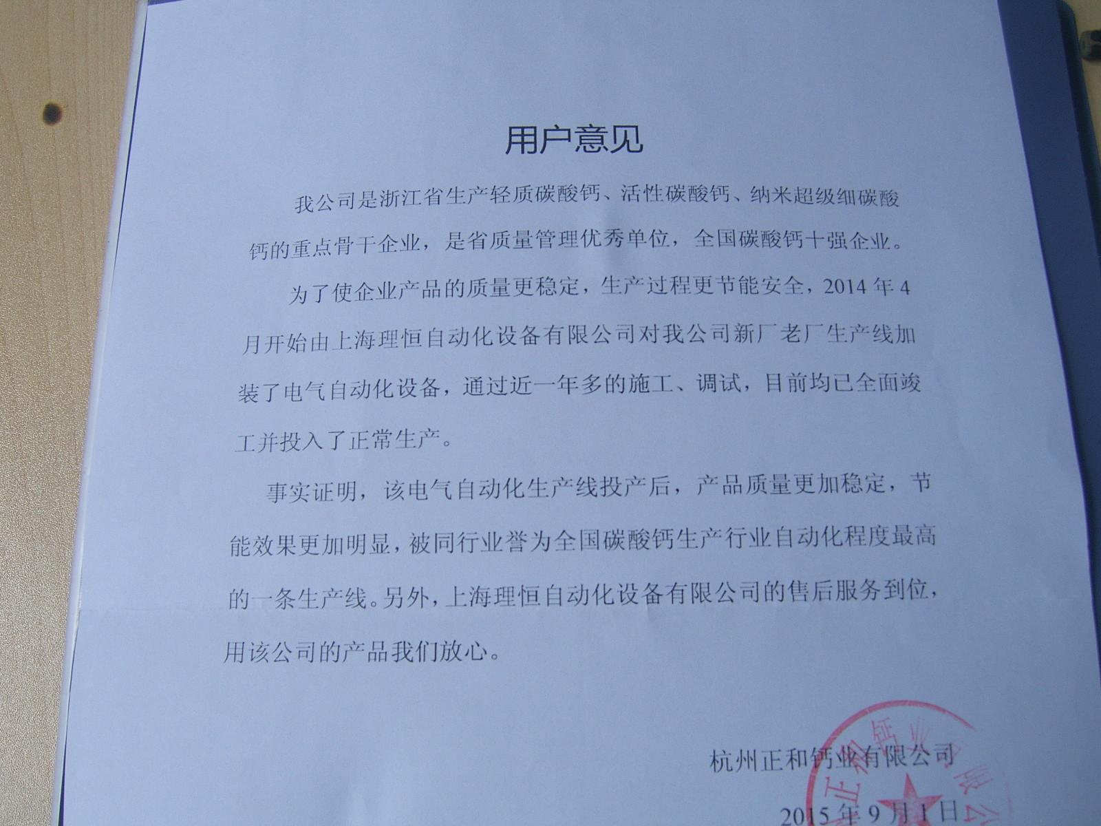 下圖為該碳酸鈣生產(chǎn)廠家出具的對我公司的設(shè)計、編程、施工及售后服務(wù)的高度評價的“用戶意見書”