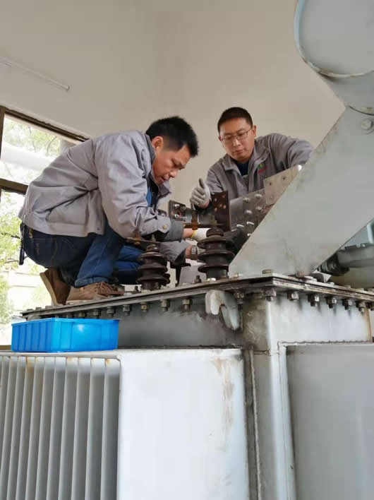 我司技術(shù)人員爬在中興能源裝備有限公司新增的污水雨水處理工程的變壓器上全神貫注地進(jìn)行銅排安裝。