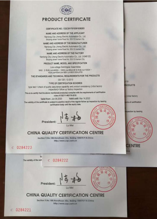 2020年6月9日,經(jīng)國(guó)家質(zhì)量認(rèn)證中心確認(rèn),我司生產(chǎn)的低壓抽出式開(kāi)關(guān)柜、交流低壓配電柜、動(dòng)力配電箱等一系列低壓成套開(kāi)關(guān)設(shè)備產(chǎn)品質(zhì)量符合CQC11-462176-2018認(rèn)證規(guī)則要求,再次獲得中國(guó)質(zhì)量認(rèn)證中心頒發(fā)的產(chǎn)品認(rèn)證證書(shū)。