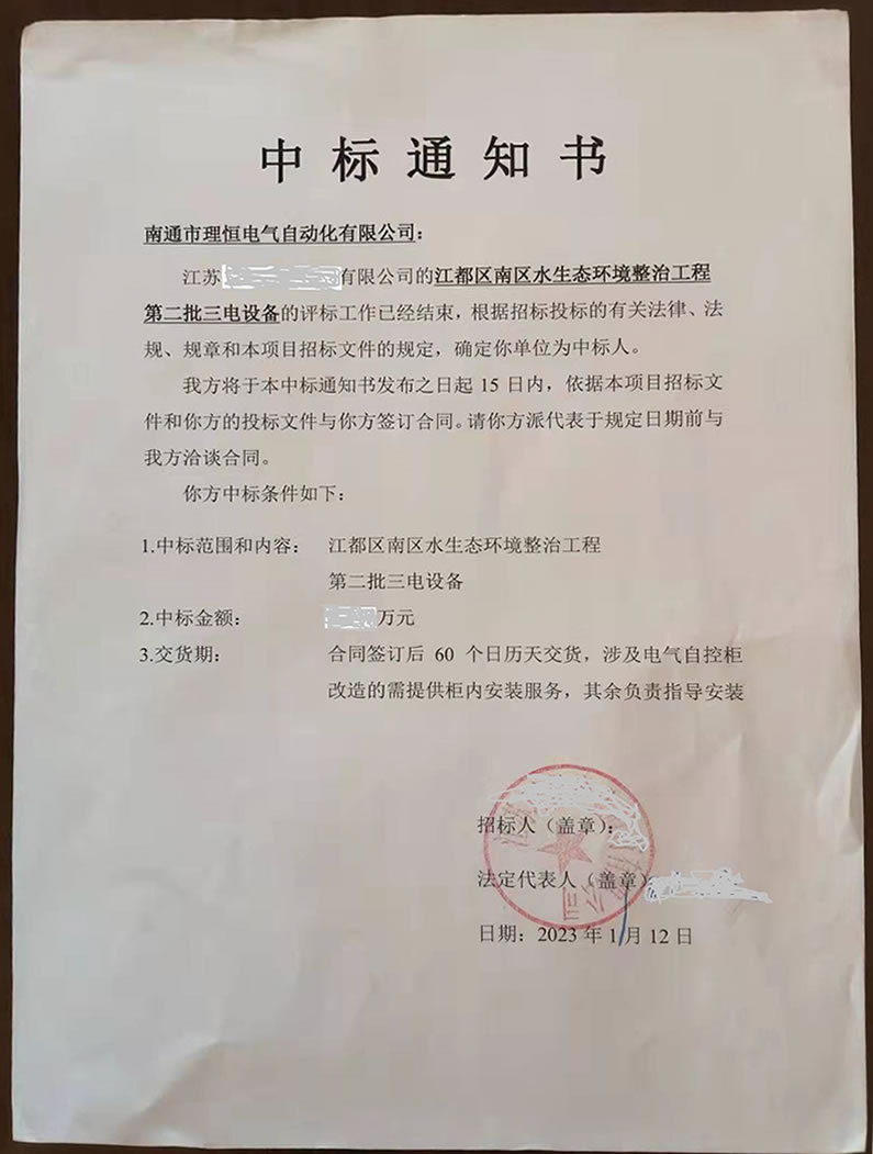 新春伊始,我司在江蘇某環(huán)保公司組織的“江都南區(qū)水生態(tài)環(huán)境整治工程第二批三電設(shè)備”的招標(biāo)活動(dòng)中獲得中標(biāo),從而揭開了新的一年的生產(chǎn)經(jīng)營(yíng)序幕,實(shí)現(xiàn)開門紅。